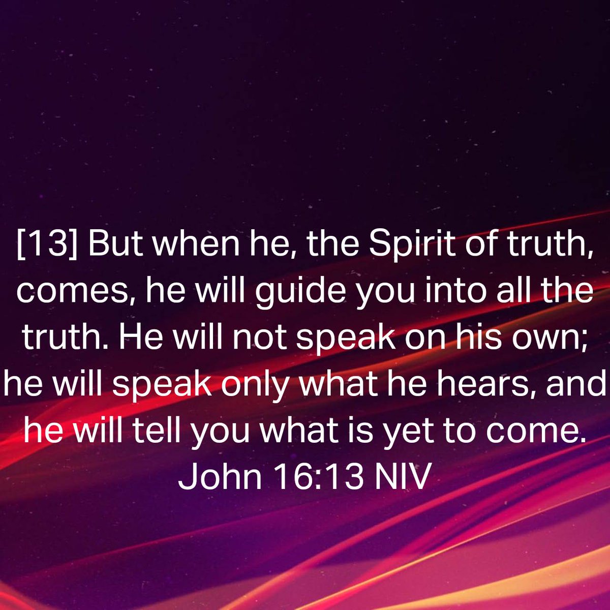 [13] But when he, the Spirit of truth, comes, he will guide you into all the truth. He will not speak on his own; he will speak only what he hears, and he will tell you what is yet to come.