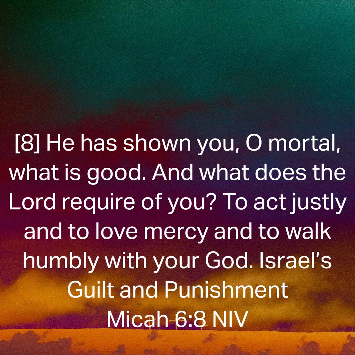 [8] He has shown you, O mortal, what is good. And what does the Lord require of you? To act justly and to love mercy and to walk humbly with your God.