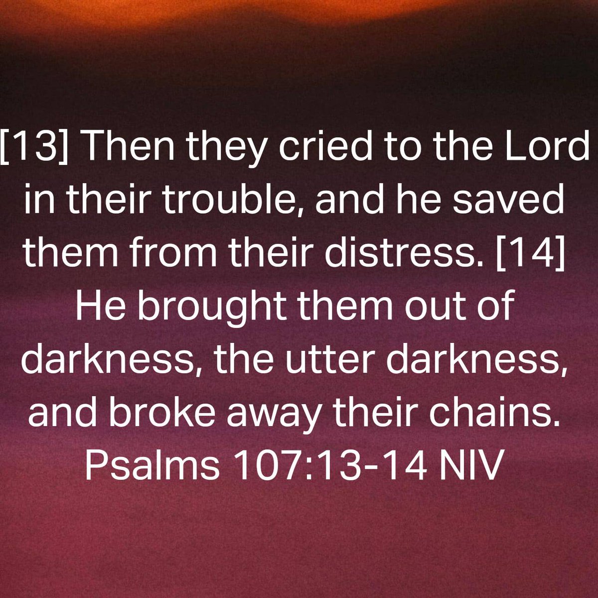 [13] Then they cried to the Lord in their trouble, and he saved them from their distress. [14] He brought them out of darkness, the utter darkness, and broke away their chains.