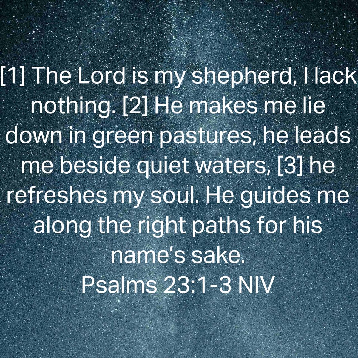 [1] The Lord is my shepherd, I lack nothing. [2] He makes me lie down in green pastures, he leads me beside quiet waters, [3] he refreshes my soul. He guides me along the right paths for his name’s sake.