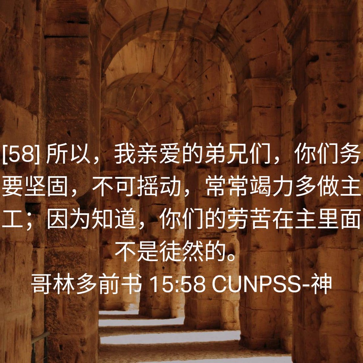 [58] 所以,我亲爱的弟兄们,你们务要坚固,不可摇动,常常竭力多做主工;因为知道,你们的劳苦在主里面不是徒然的。