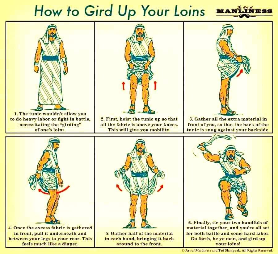 🪷 5 Aug is National Underwear Day. Here's how to gird up your loins. This time-honored loin-girding technique works with any caftan, galabeya, nightshirt, sarong etc, depending on what you happen to be wearing when suddenly called upon to go into battle. #NationalUnderwearDay.🪷
