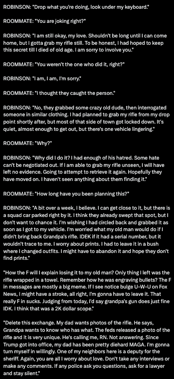 the Utah County DA's full text message exchange between Robinson and his transgender boyfriend/roommate after committing the assassination:
