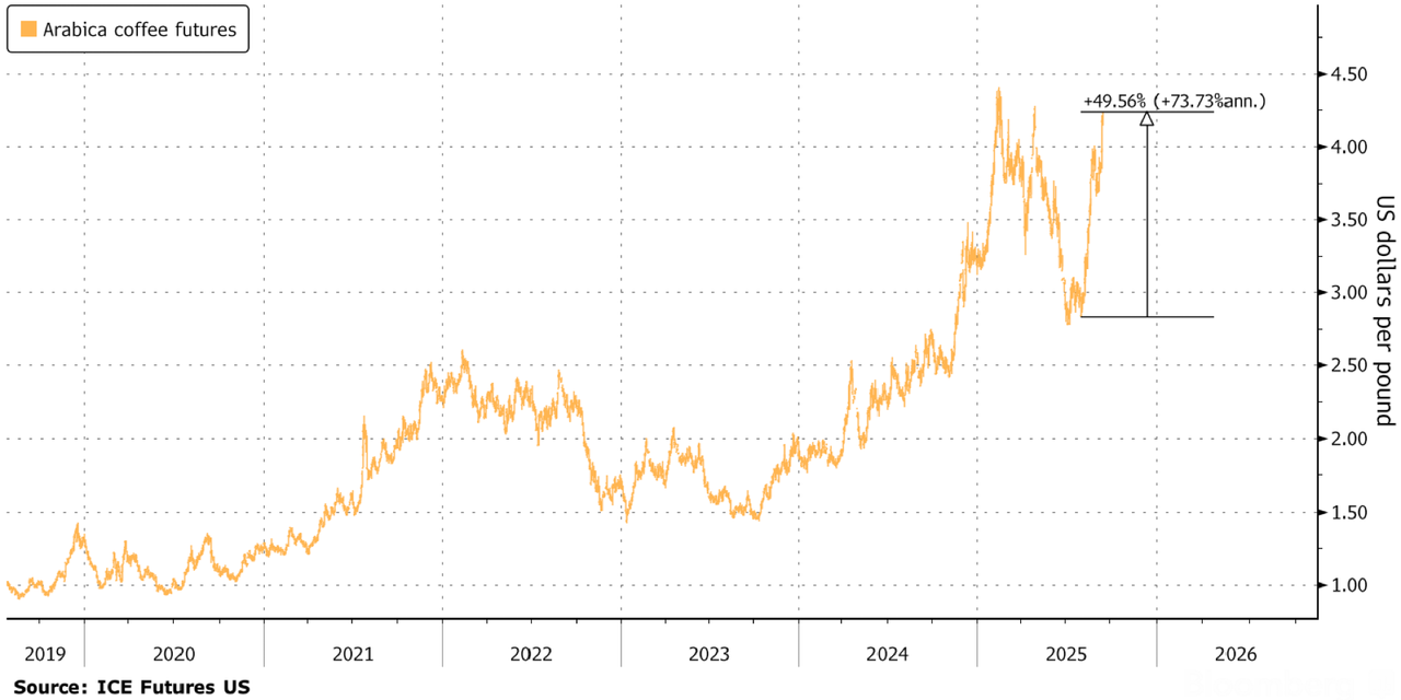 Arabica, the premium bean used by Starbucks, Dunkin', and other chains, jumped as much as 6.2% to $4.21 on Monday, with momentum easing on Tuesday as $4.20 emerged as a line of resistance. Notably, futures have surged nearly 50% since early August.