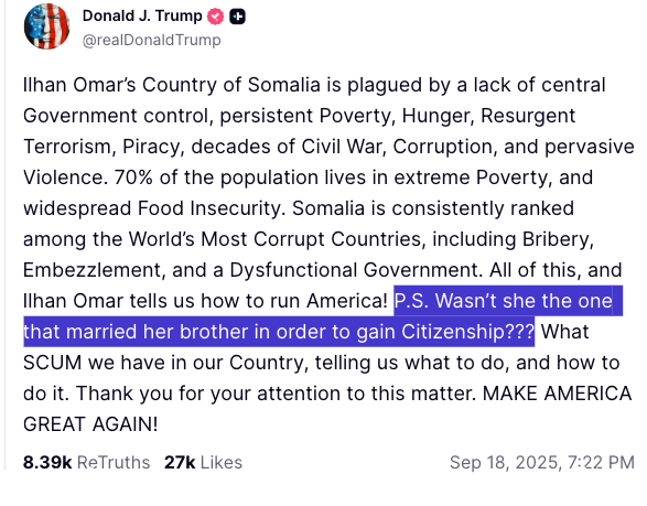 BREAKING: In the wake of Ilhan Omar calling Charlie Kirk and his supporters pieces of shit, President Trump says that she should be IMPEACHED from Congress.