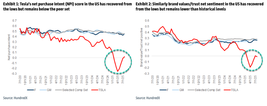 New consumer survey data from HundredX and Morning Consult, which tracks net purchase intent and net buzz around the vehicle brand, shows sentiment improving. Earlier this year, Democratic Party–aligned dark-money-funded NGOs waged an informational war against Tesla over Musk's involvement with DOGE, but with that propaganda campaign subsiding many months ago, consumers appear to be returning to the brand.