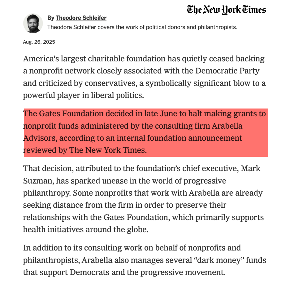 As we noted, citing a recent NYT report, the Gates Foundation was a major donor for Arabella Advisors and abruptly cut ties this past summer.
