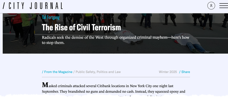 describes the rise in far militancy as "nihilistic accelerationism" suggesting that "Far-left extremism extends far beyond groups like Antifa. There is an entire revolutionary (marxist) ecosystem of interconnected entities: billion-dollar progressive NGOs, anarchist networks, political organizations such as the DSA, foreign influence operations like the Singham network, gaming platforms, Discord servers and reddit threads, the dark web, and even civil-rights organizations staffed with "movement lawyers" fully dedicated to waging war against the West until it collapses."