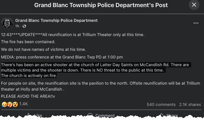 post, stating: "There has been an active shooter at the Church of Jesus Christ of Latter-day Saints on McCandlish Road. There are multiple victims and the shooter is down. There is no threat to the public at this time. The church is actively on fire."