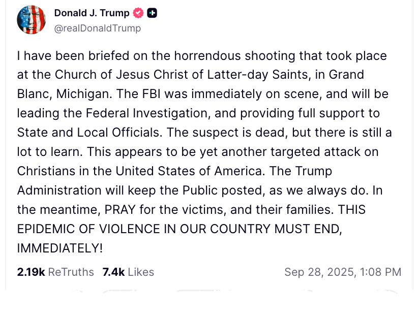 On X, FBI Director Kash Patel said that the agency is "tracking reports of the horrific shooting and fire at an LDS church in Grand Blanc, Michigan."