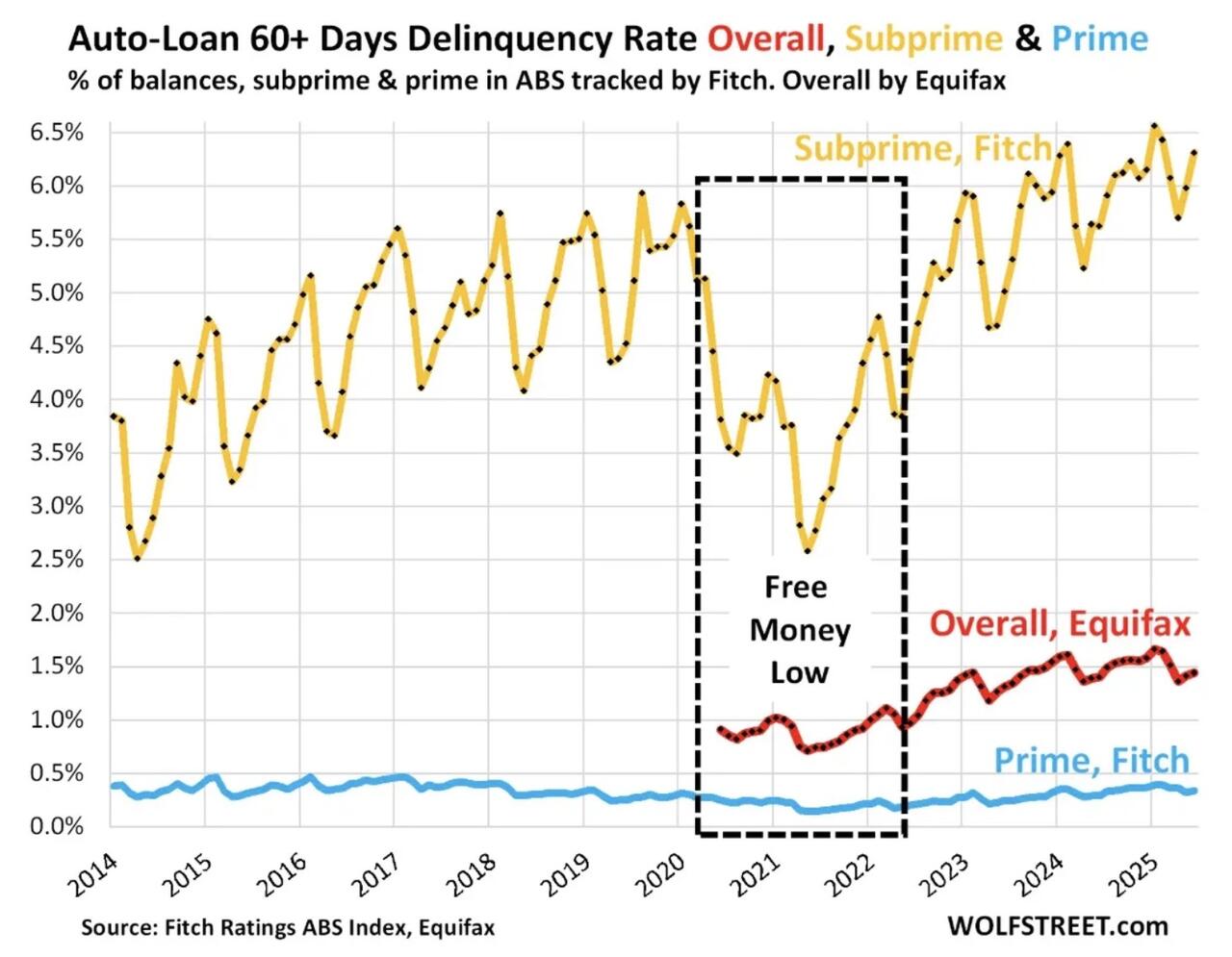 Delinquencies on auto loans 90 days past due reached 5% in the second quarter of 2025, up more than 12% from a year earlier.š✠Net losses in subprime auto ABS were running at 9.44% as of January.šⴠRecovery rates were weak because wholesale used-car prices remained high, with the Manheim index still up 2.2% year over year in September.šâľ