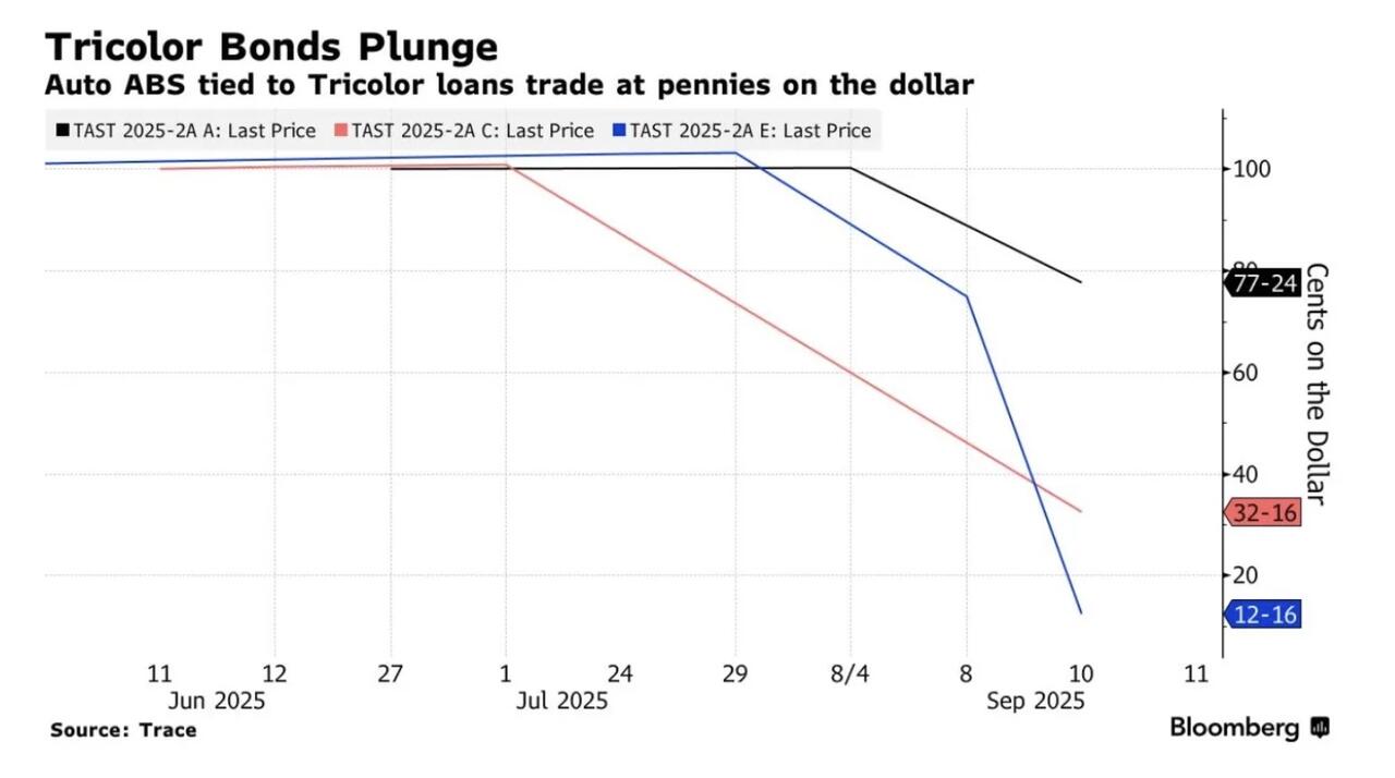 Also in September 2025, Tricolor Holdings, a major subprime auto lender focused on low-credit and undocumented borrowers, filed for bankruptcy and said it would liquidate. Federal prosecutors were investigating allegations that the company had pledged the same collateral multiple times to warehouse lenders.š⸠š⚠Big banks including Fifth Third, JPMorgan, and Barclays were left staring at hundreds of millions in potential losses.