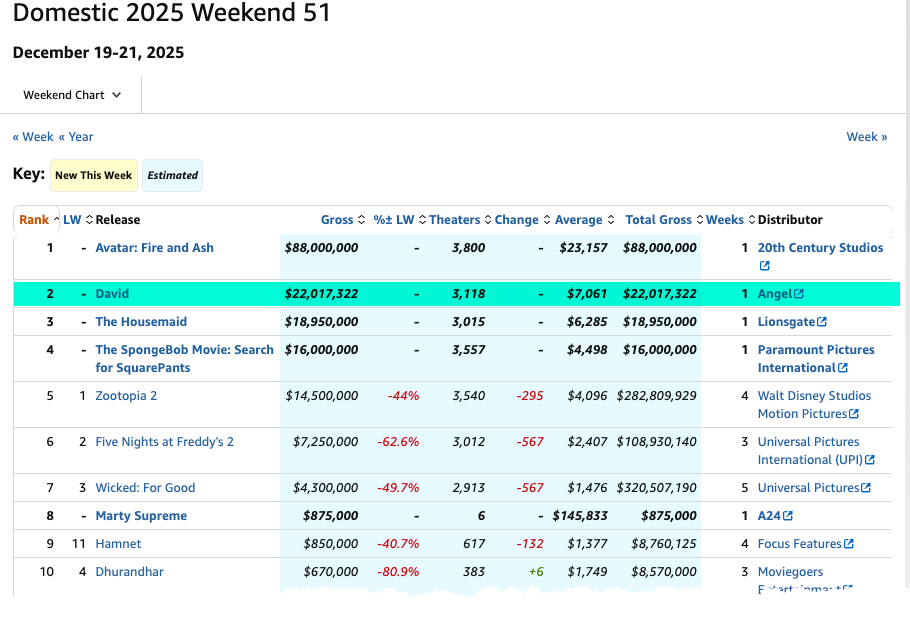 From December 19 to 21, Mojo's data showed that David was in 3,118 theaters and earned $22 million over the weekend, placing it in the number two spot, just behind Avatar: Fire and Ash.