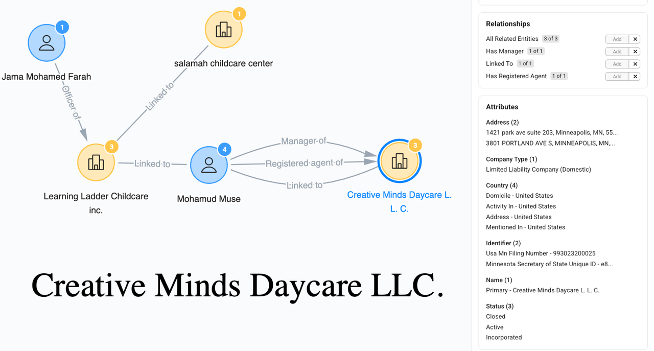 Shirley and the private investigator note that Creative Minds Daycare L.L.C. was shuttered due to violations and reopened the next day as Super Kids Daycare Center LLC.