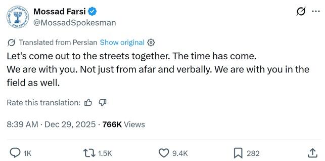 A Farsi-language X account claiming to represent Israel’s Mossad https://x.com/MossadSpokesman/status/2005649986504237381?s=20