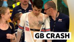 Great Britain's Charlie Tanfield has a nasty crash on the final bend of the men's team pursuit qualification at the Cycling World Championships 2023 in Glasgow. #press