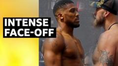Watch as two-time heavyweight champion Anthony Joshua exchanges words with opponent Robert Helenius during their weigh-in. #press