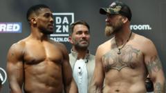 Anthony Joshua exchanges words with stand-in opponent Robert Helenius at an intense weigh-in ahead of Saturday's heavyweight fight in London. #press