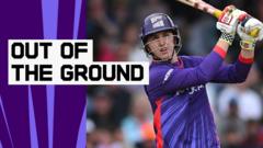 Northern Superchargers' Harry Brook hits Usama Mir for a huge six over the top of the Rugby Stand at Headingley #press