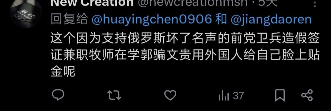 这个人几个月以来一直毁谤我,只要我发一条推文就在下面毁谤我,并且有一些弟兄姊妹给我留言,它也故意跟帖在他们面前抹黑我,看来我是被盯上了,不知道是不是得罪某个利益群体了,因为正常人谁会那么闲,几个月来孜孜不倦的盯着我的推文…