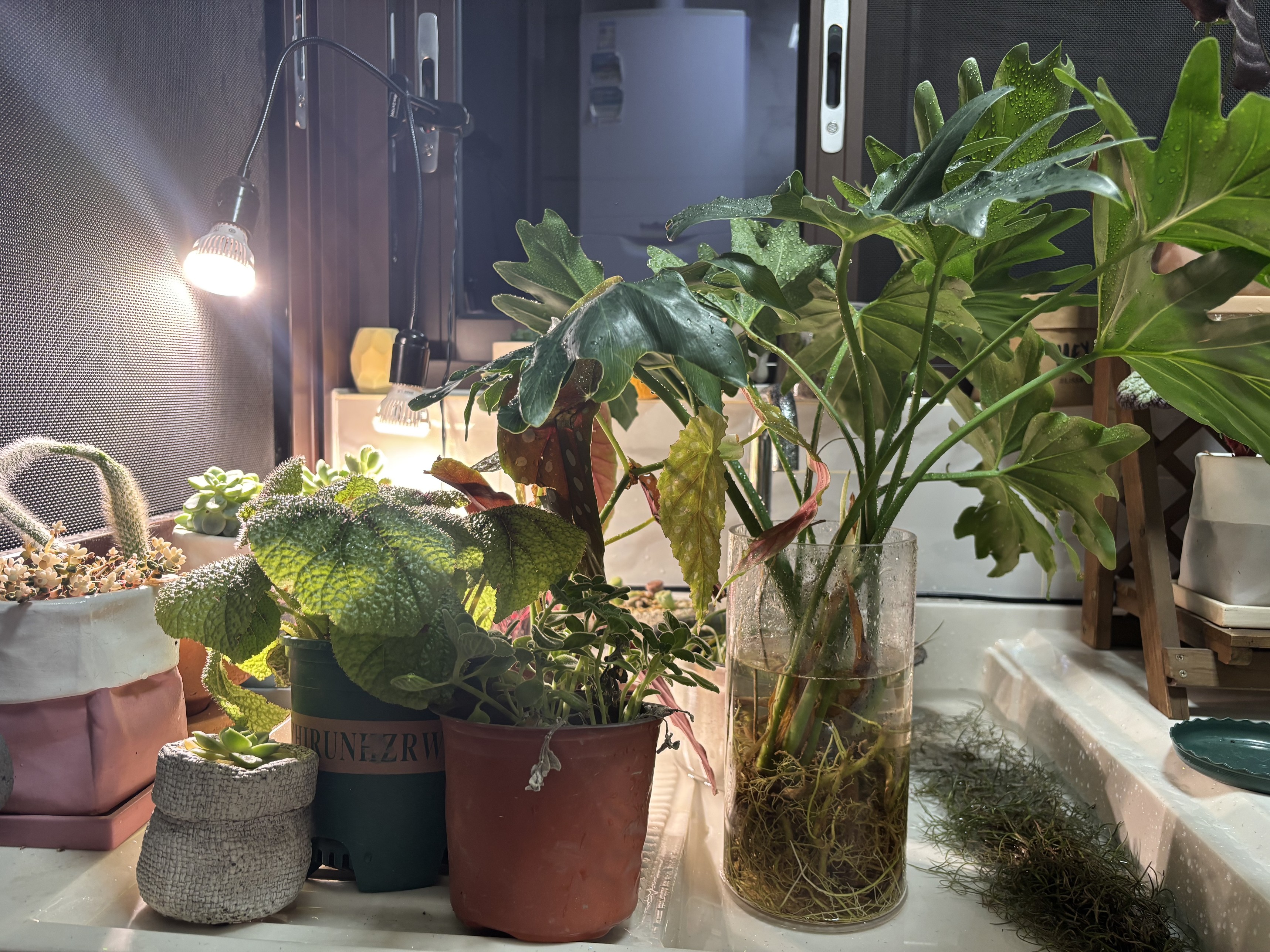 浇第二轮花,虽然我的龙鳞春雨是水培的,可是它巴掌大的叶片一定是喜欢水的,用喷壶给它的每一片叶子都喷上水,让它感受一下老家热带雨林的潮湿。