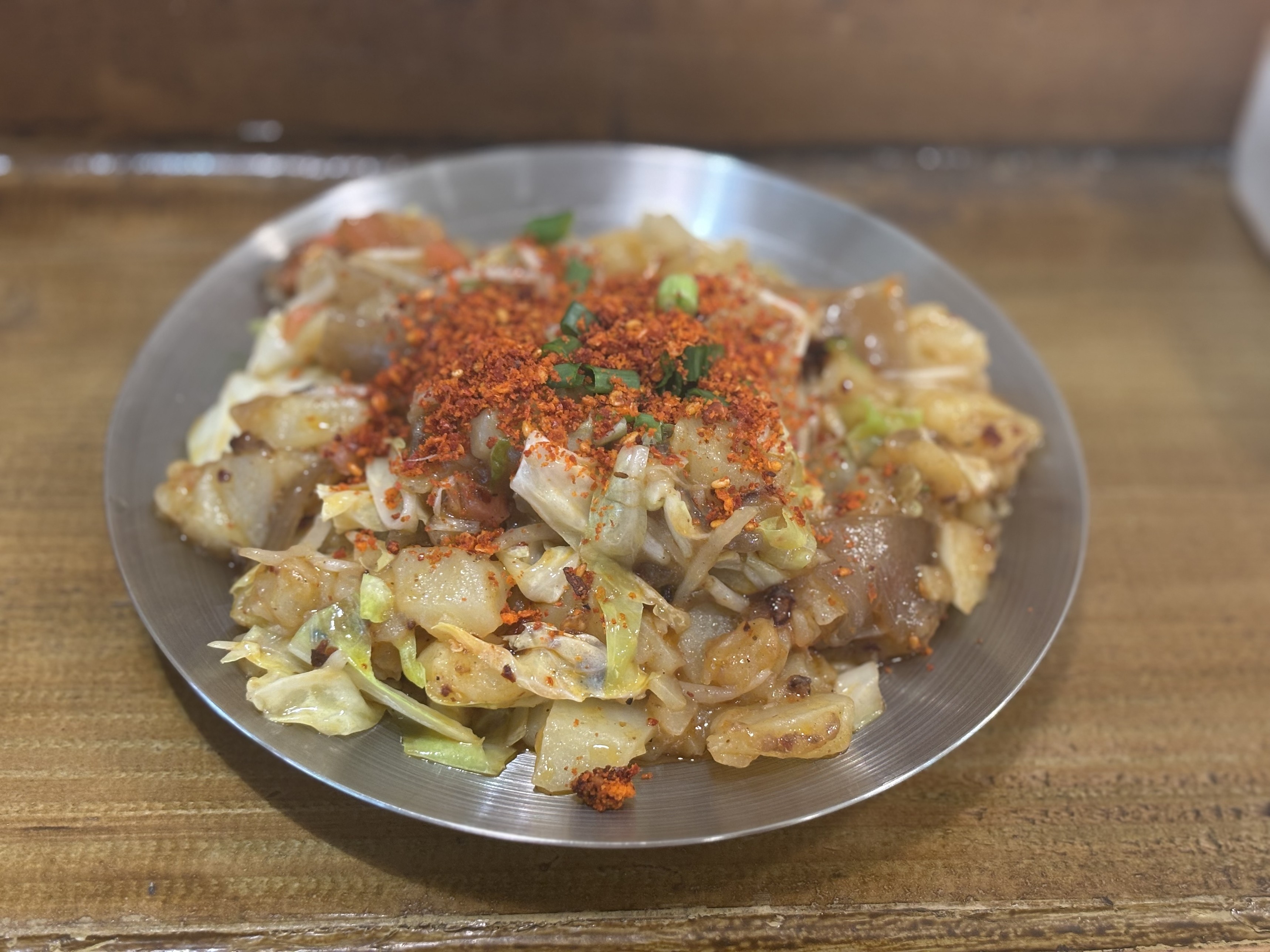 还是这个比较好吃,洋芋炒苕皮,我还问了老板有没有甜面酱,贵阳街边的这种炒菜小吃摊通常会摆着他们自己调的甜面酱,浇在上面,混着辣椒面可好吃了,所以贵阳人的口味并不是纯辣,它有时候其实是甜辣口的。