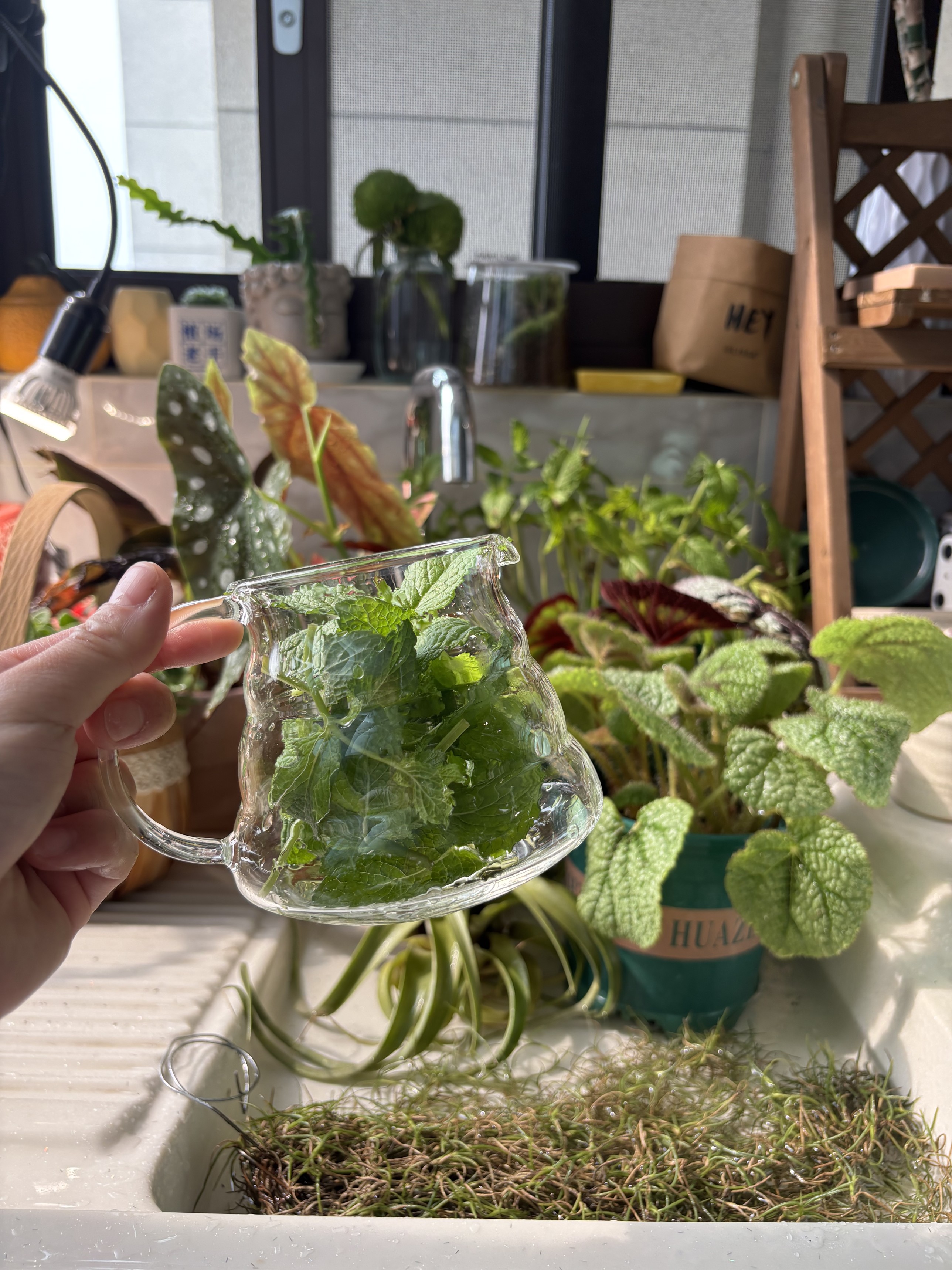 今天放纵日,必须要放个大招。打理笨笨的小花园剪了一茬薄荷吃,看看去除顶端优势它会不会长得好一点。