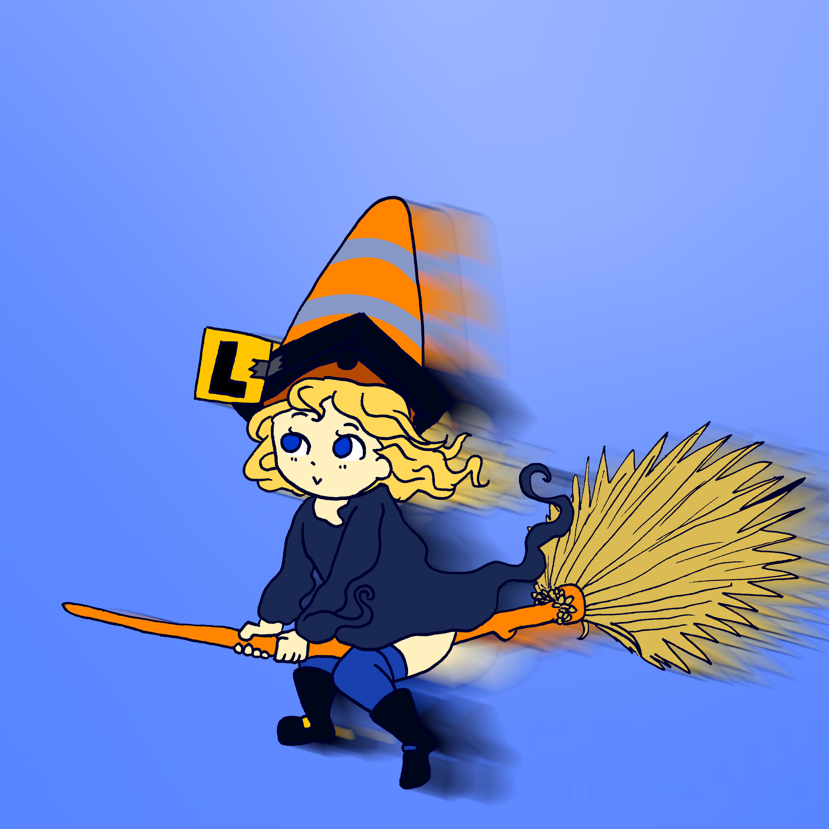 #loli #art #lolicon #sfw #sfwart #witch #flying #learner #magic #broom #learner #blonde #trafficcone #witcheshat #stockings #robe #bots #booties #thighhighs
