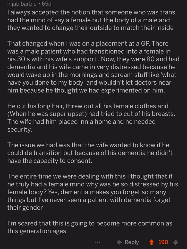 nostr:npub1egvswnt7kelt7x9wew3sakuavpq8a4kg9leyp59xqfj5rwnayq2qgk9zfr sex change operations (as they were known back then?) Were very rare 50 years ago, weren't they? Like it seems more likely that someone who did it then actually had an actual condition like gender dysphoria?