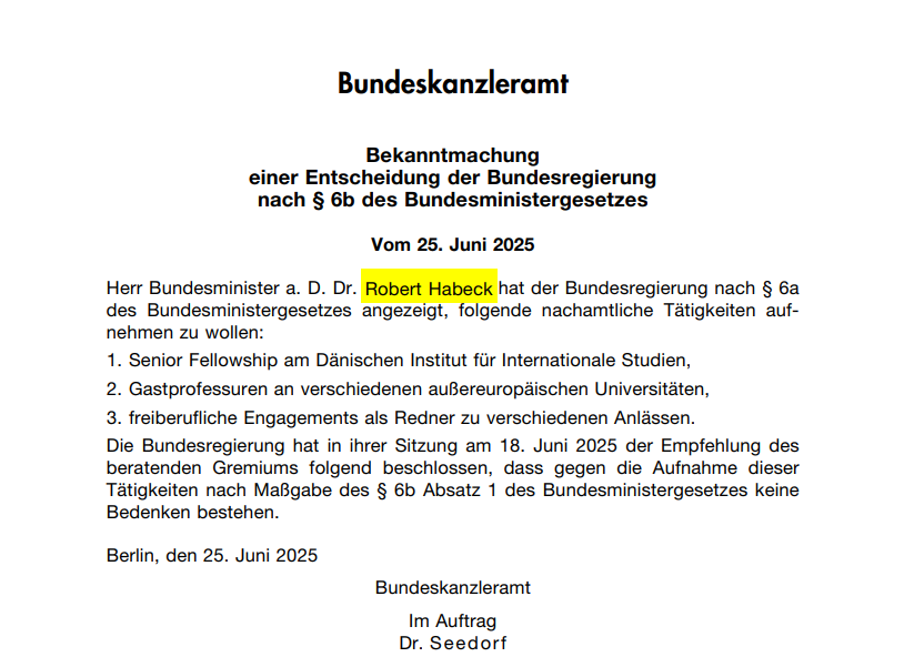 Neue Jobs für Robert #Habeck: Der Ex-Minister wird Senior Fellow am Dänischen Institut für Internationale Studien, nimmt Gastprofessuren außerhalb Europas an und tritt als Redner auf.
