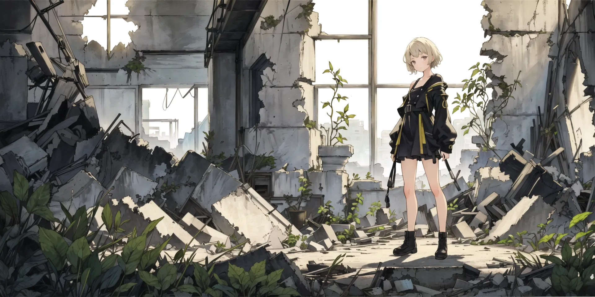 #majinai (masterpiece, best quality, ultra detailed sharp focus illustration:1.2), 12yo 1girl, platinum blonde short hair, hazel eyes, looking at viewer, dynamic pose, standing indoors in the ruins of a large-scale factory, where the light shines and the plants grow