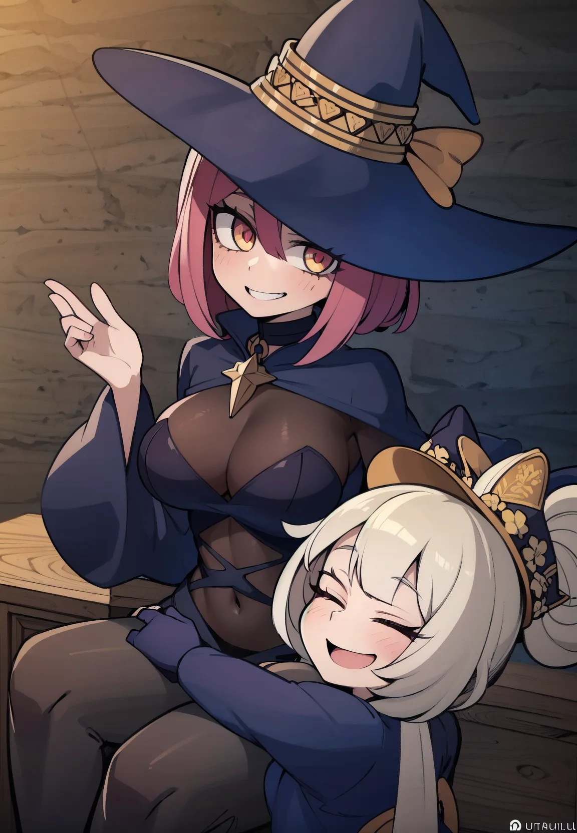 #majinai masterpiece #best #quality #super #fine #illustration #ultra-detailed #resolution #unity #8k #wallpaper #by #famous #artist #ultra_beautihul_girl #ultra_kawaii_girl #ultra_cute_girl #witch #witch #hat #large #breasts #couple #sitting #teasing #smile #to8contrast #style #chibi