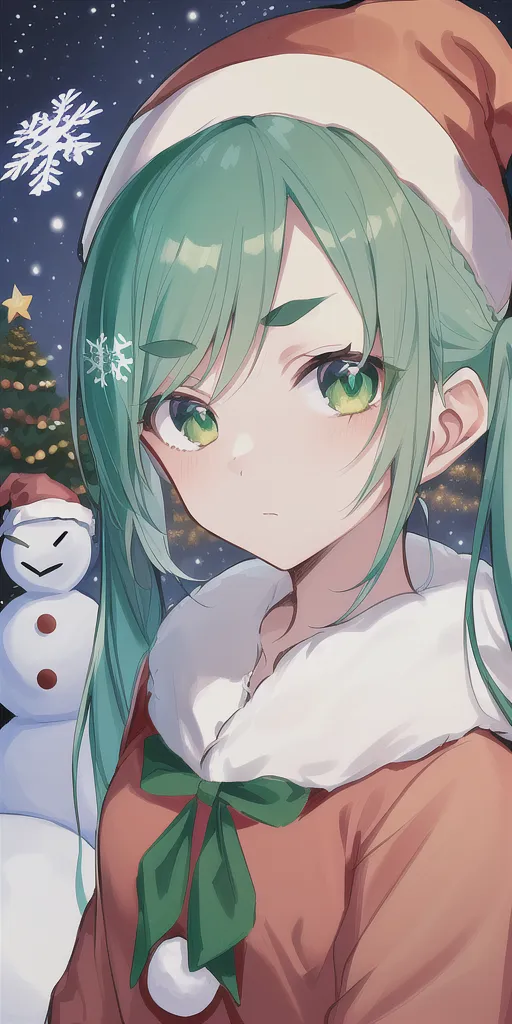 #majinai masterpiece, best quality, (((ononoki yotsugi))), ((1girl)), ((aqua hair)), green eyes, loli, ((short twintails)), flipped hair, (thick eyebrows), (monogatari (series)), ((masterpiece)), (watanabe akio), ((expressionless)), highres, ((beautiful detailed background)), straight hair, (beautiful detailed eyes), (best quality), short hair, (illustration), (ultra-detailed), night, ((cinematic lighting)), ((masterpiece portrait)), hat, (looking at viewer:1.7), ((santa costume)), ((santa hat)), christmas tree, ((snowflakes)), starry sky, ((snowman)), (path), (snow), snowing, moon,