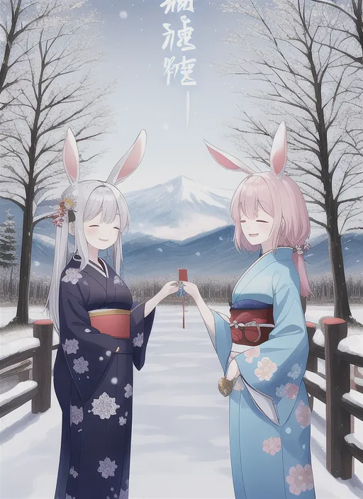 #majinai #New #Year #greeting #card #Year #of #the #Rabbit #rabbit #traditional #Japanese #garment #kimono #happy #expression #content #expression #closed #eyes #slight #smile #pale #pink #color #white #gold #floral #pattern #snowy #landscape #trees #mountain #range #pale #blue #color #flakes #of #snow #wintery #shades #of #white #blue #pink #greeting #card #animal #clothing #appearance #emotion #background #surroundings #setting #environment #location #place #scene #context #ambiance #mood #color #scheme #color #hue #shade #tone #pigment #dye #tint #chroma #saturation #value #intensity #brightness #luminosity #luminance #radiance #glow #shine #lustre