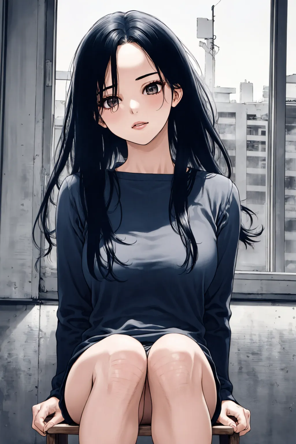 #majinai #boichi #manga #style #1girl #solo #sitting #long #hair #upper #body #masterpiece