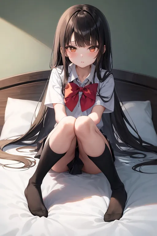 #majinai #masterpiece #best #quality #highly #detailed #beautiful #face #and #eyes #beautiful #and #clear #background #1 #gril #kawaii #loli #shot #from #front #full #body #shot #sitting #hands #between #legs #black #long #straight #hair #blunt #bangs #summer #school #uniform #bed #room #drooping #eyes #black #crew #socks #shame