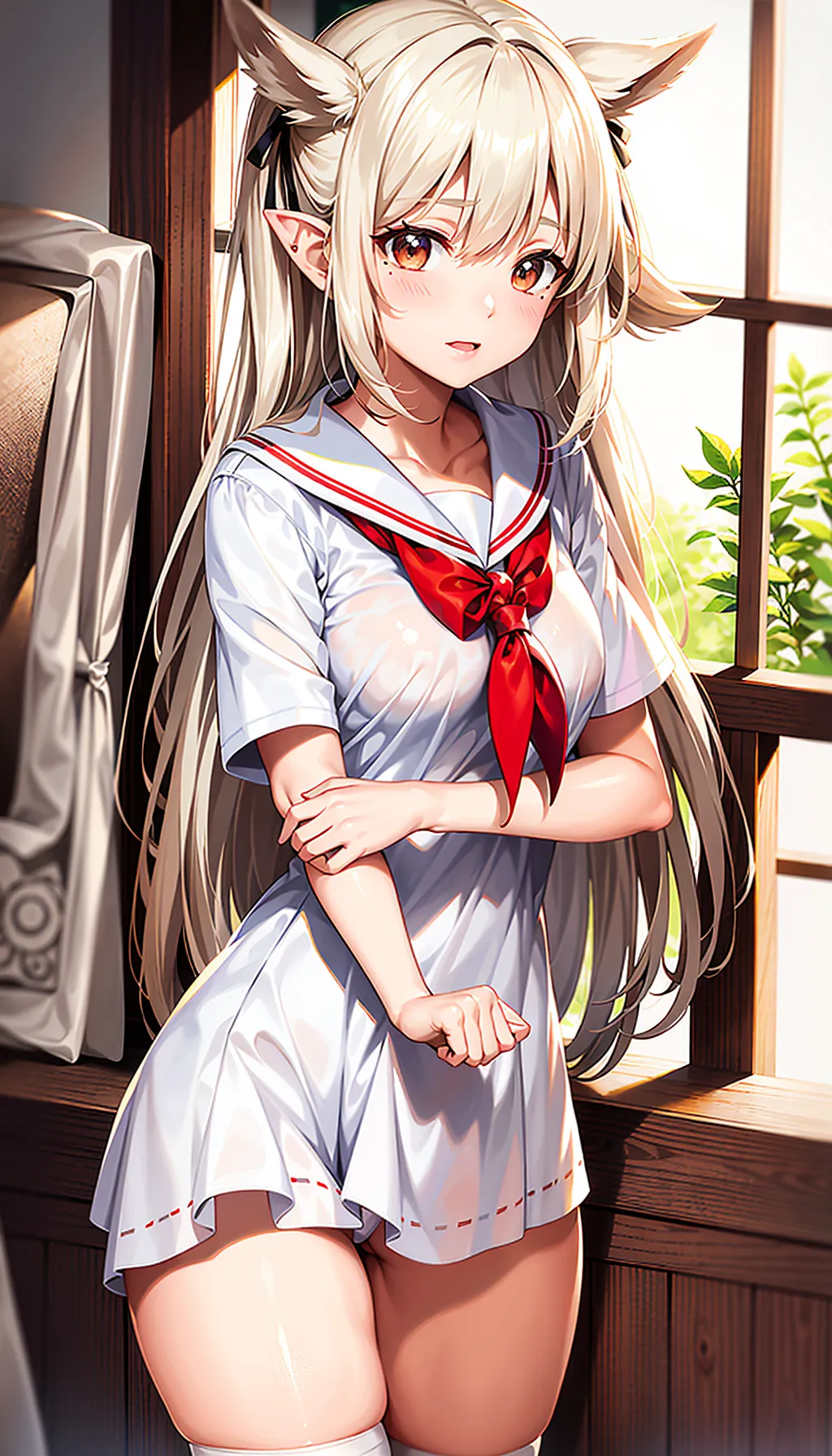 #majinai #masterpiece #best #quality #girl #cute #face #brown #eyes #mole #on #breast #sailor #shirt #white #kneehighs #uwabaki #hair #ribbon #hair_bow #arm #at #side #long #hair #platinum #blonde #hair #pointy #ears