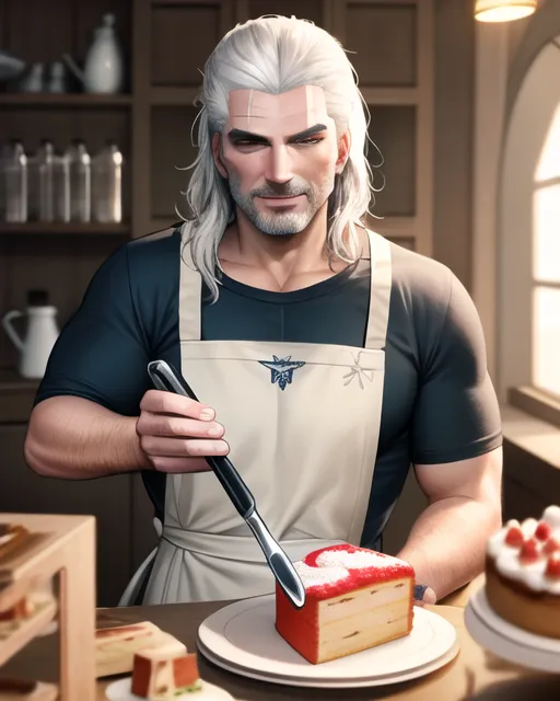 #majinai #solo #best #masterpiece #1male #witcher #geralt #of #rivia #finely #detailed #face #mature #male #manly #smile #wear #an #apron #cake #making #in #the #pretty #kitchen #surrounded #by #stuffed #toy