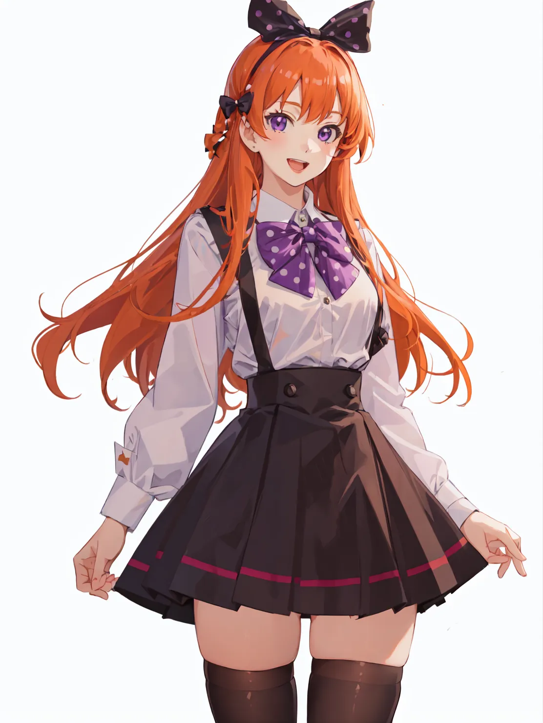 #majinai #best_quality #masterpiece #ultra_detailed #highres #production #art #1girl #thighhighs #solo #purple #eyes #orange #hair #bow #polka #dot #bow #school #uniform #hair #bow #long #hair #polka #dot #zettai #ryouiki #smile #open #mouth #black #thighhighs #skirt
