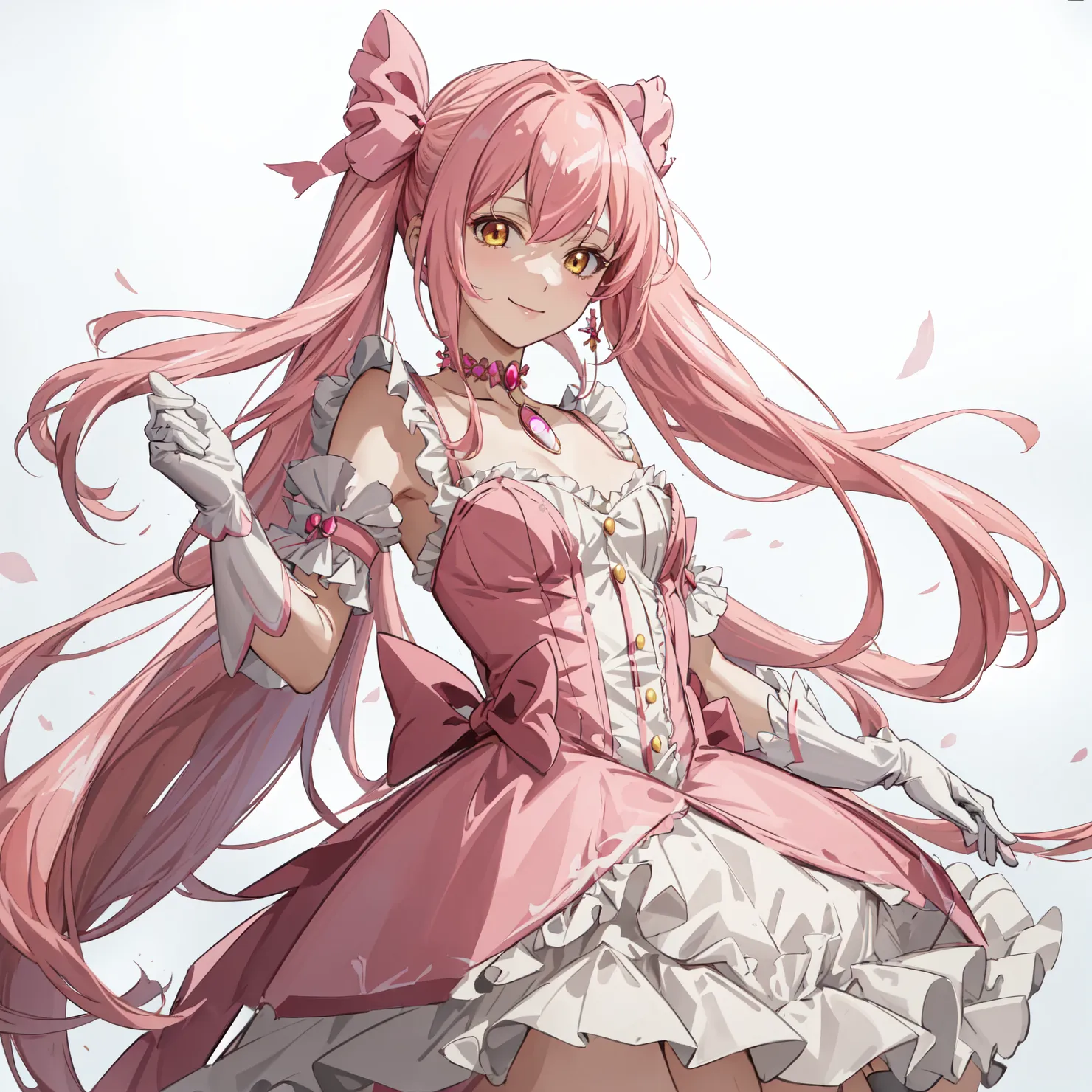 #majinai #best_quality #masterpiece #ultra_detailed #highres #production #art #1girl #ultimate #madoka #solo #kaname #madoka #pink #hair #long #hair #yellow #eyes #gloves #two #side #up #ribbon #magical #girl #bow #choker #hair #bow #smile #hair #ribbon