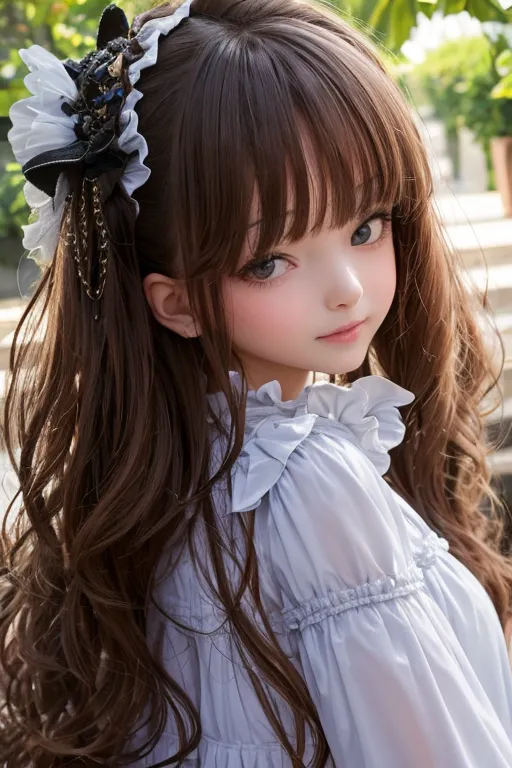 #majinai #close #up #of #a #cat #on #a #teenage #woman #head #in #flower #garden #clear #face #insanely #excess #frilled #white #dress #long #sleeved #highneck #frilled #dress #absurdly #long #brown #hair #kind #smile