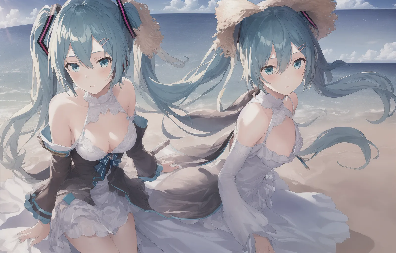 #majinai #1girl #masterpiece #best_quality #miku #seaside #sunrise #sky #sea #solo #hairclip #in #summer #official #art #intense #angle #dramatic #angle #detailed #clothes #detailed #face #detailed #eyes #detailed #background #detailed #skin