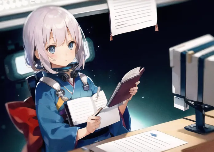 #majinai #A #girl #writing #in #a #notebook #a #doll #in #a #space #suit #on #the #desk #a #computer #on #the #desk #Girls #wear #kimono #medium #shot