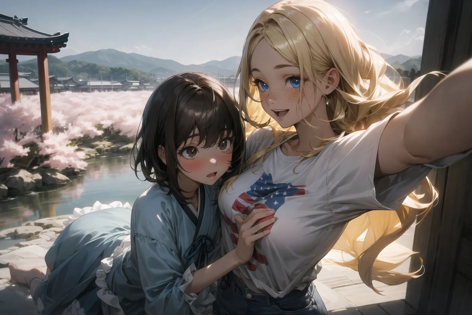 #majinai #Ultra #Detailed #Relaxed #Beautifully #Lit #absurdres #best #quality #realistic #ultra #high #res #landscape #of #a #kyoto #Spring #2girls #sightseeing #BREAK #2girls #short #black #hair #dark #brown #eyes #pale #skin #skinny #surprised #light #blush #small #breasts #shiny #hair #shiny #skin #petite #Large #eyes #east #asians #white #Shirt #dress #with #many #frills #blue #ribbon #girlish #feminine #BREAK #2girls #blonde #long #wave #hair #shiny #hair #shiny #skin #blue #eyes #suntanned #skin #light #freckles #Medium #breast #Caucasian #tall #image #American #flag #t-shirt #denim #laughing #dynamic #pose #pastime #selfie