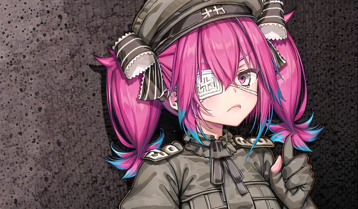 #majinai #masterpiece #best #quality #ultra-detailed #illustration #1girls #17yo #upperbody #mayoinachi #girl #hair #ribbon #pink #and #cyan #multicolored_hair #long #hair #black #eyepatch #frown #badmood #close #mouth #black #glove #looking #at #viewer #lift #hands #grab #glove #black #military #uniform #black #military #hat
