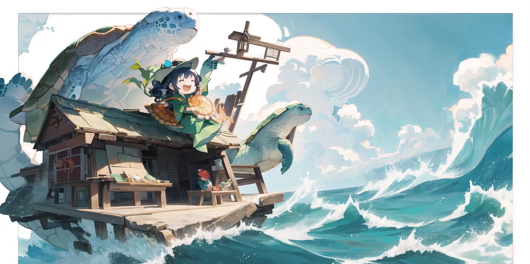 #majinai #1girl #solo #best #quality #ultra-detailed #illustration #Urashima #Taro #Japanese #folklore #ocean #fish #riding #on #sea #turtle #dragon #palace #colorful #traditional #clothing #kimono #wavy #hair #happy #expression #holding #a #treasure #box #chibi #white #background #white #border