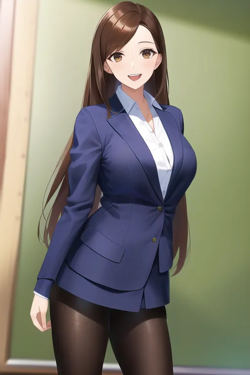 #majinai #masterpiece #best #quality #1lady #teacher #deep #brown #hair #long #hair #brown #eyes #suits #tights {{smile}} #open #mouth