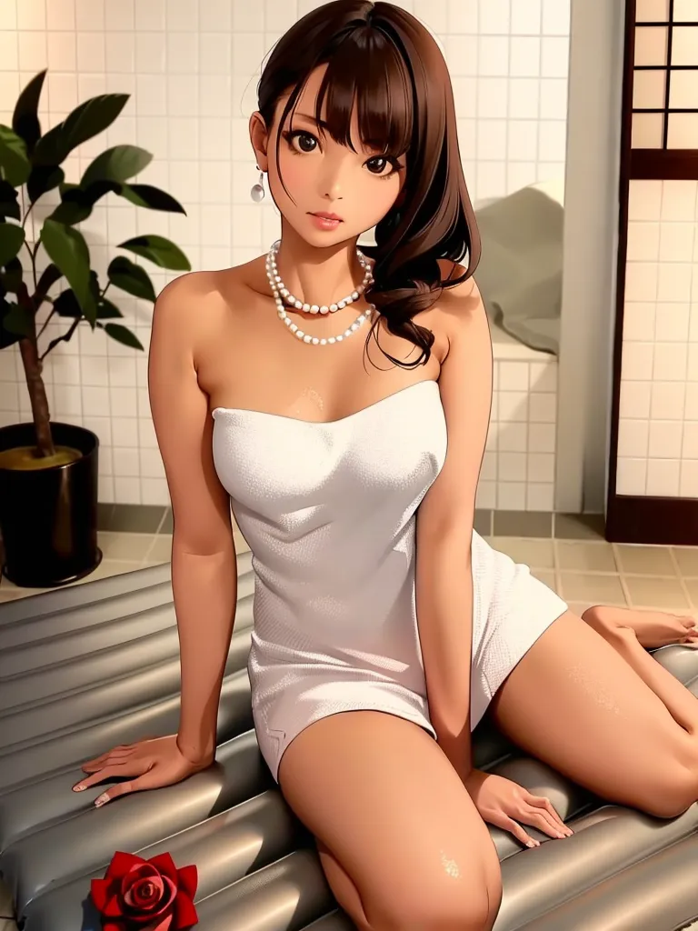 #majinai #masterpiece #best #quality #ultra-detailed #illustration #soapland #soapmat #1girl #naked #towel #solo #jewelry #brown #hair #necklace #looking #at #viewer #arm #support #barefoot #lips #sitting #medium #breasts #pearl #necklace #yokozuwari #plant #flower #rose #bathing #bathtub #sitting #indoors #flower #tiles #tile #wall