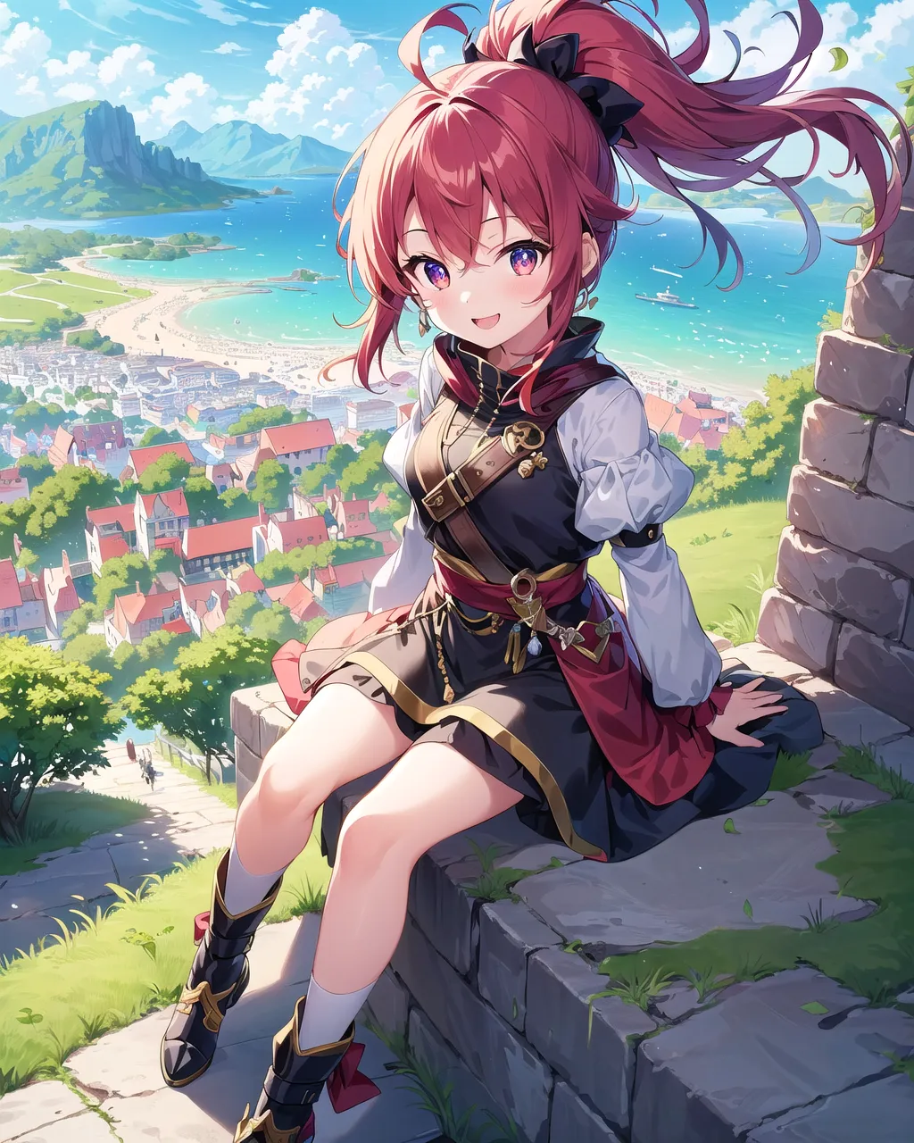 #majinai #masterpiece #best_quality #illustration #ultra-detailed #1girl #loli #child #body #Overlooking #the #Brick #city #on #the #bay #at #the #foot #of #the #mountain #smile #strong #wind #shiny #red #hair #large #eyes #tsurime #adventure #hunter #Medieval #Fantasy