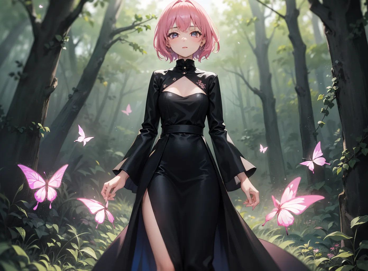 #majinai #1girl #short #pink #hair #long #black #dress #forest #night #glowing #butterflies #magic